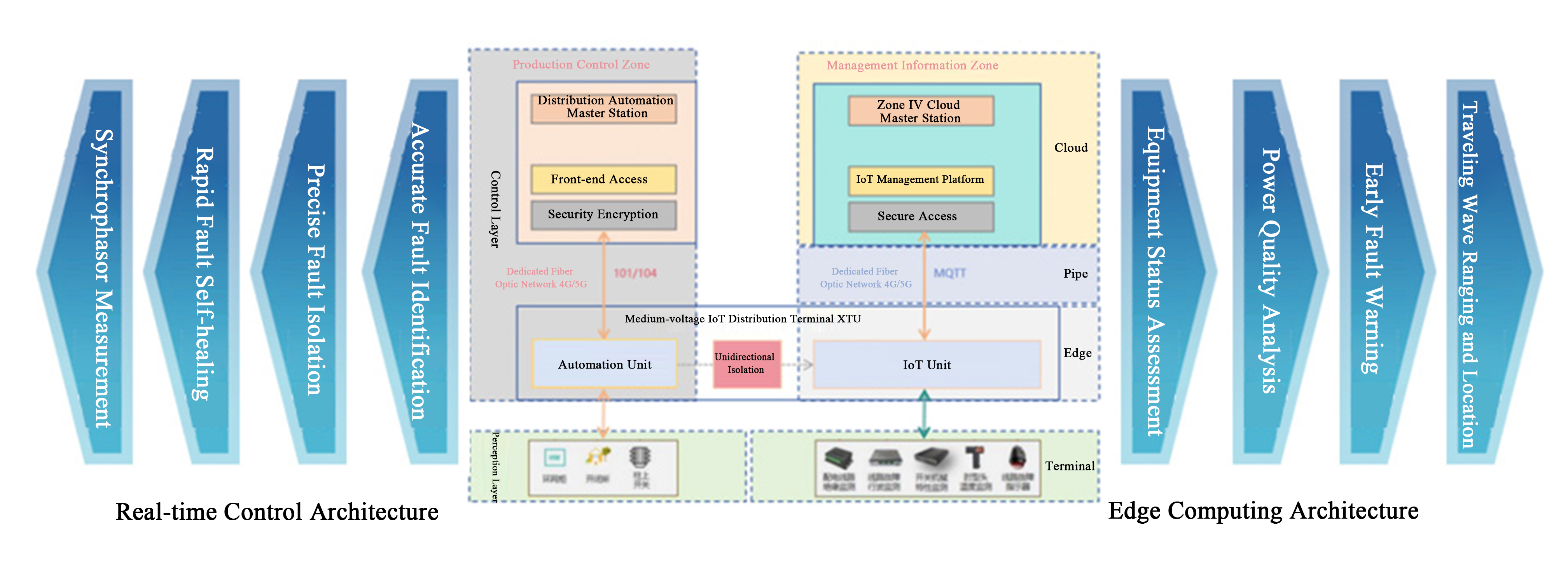The core of the medium-voltage IoT distribution terminal (XTU) consists of a distribution automation unit and an IoT unit, with one-way data communication within the terminal facilitated by a micro one-way physical isolation gateway between them. The terminal does not alter the original communication method of distribution automation service data with the distribution automation master station (production control zone), but adds an operation & maintenance service data communication channel to enable data exchange between the terminal and the distribution automation cloud master station (management information zone). The terminal's hardware, software, and debugging & maintenance adopt modular and configurable designs to meet flexible on-site configuration requirements.
