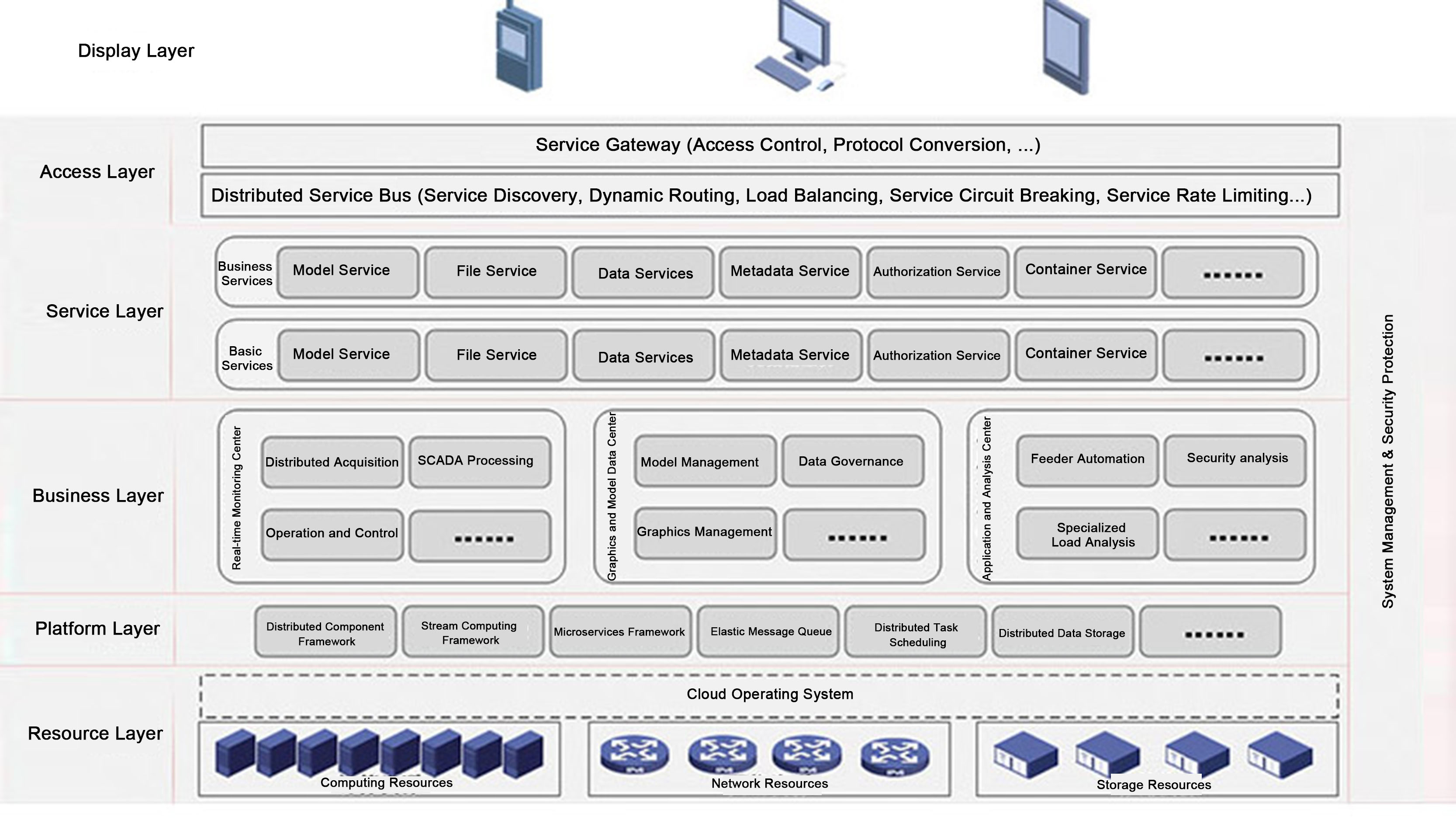 The Elastic Dispatching and Control Support Platform is based on the advanced "Cloud-Native" design philosophy. It reconstructs traditional platform architecture using technologies such as containers, container orchestration, microservices, and service mesh to establish a data processing model and application support framework compatible with cloud computing. The platform breaks away from the centralized or grouped active/standby processing models of traditional monitoring software, implementing a cluster-based parallel processing model. This provides application systems with dynamic scalability for data acquisition, processing, and business services. Resource Layer: Provides the physical or virtual resources required for system operation, corresponding to conventional deployment and cloud computing deployment modes, respectively. In the cloud computing deployment mode, virtual resources are uniformly scheduled and managed through a cloud operating system.